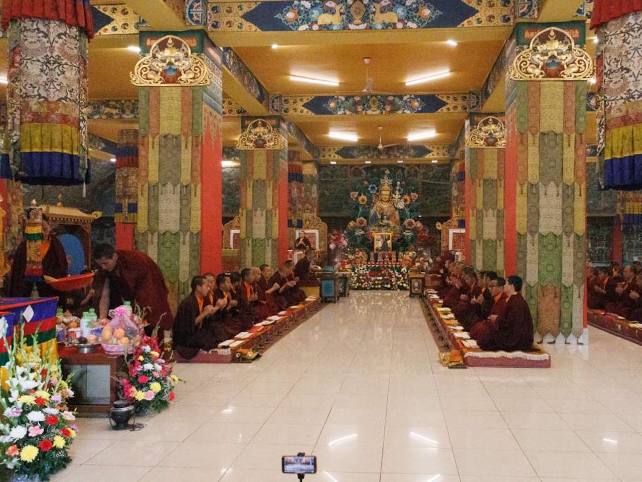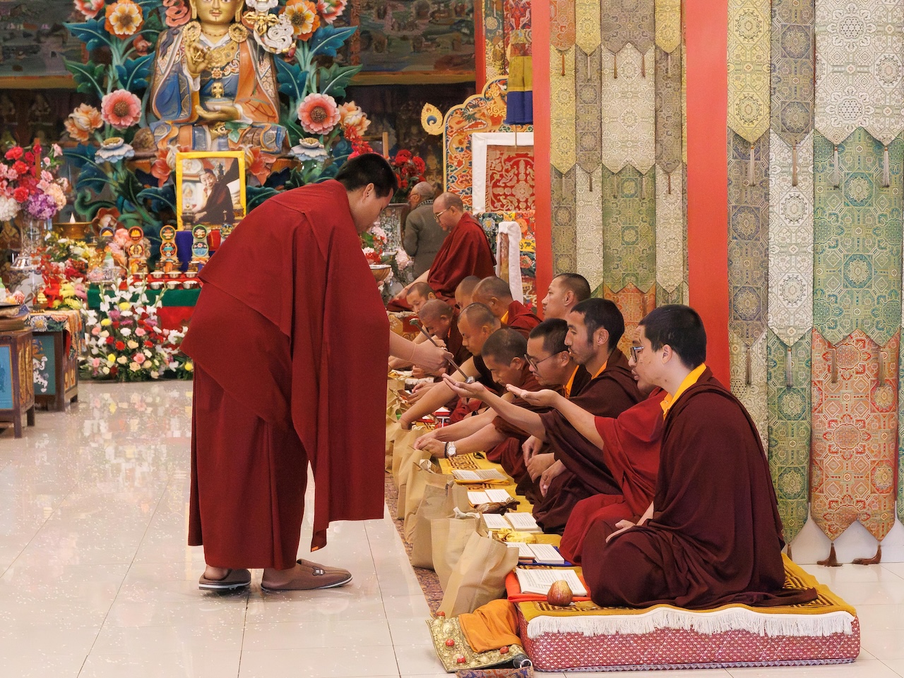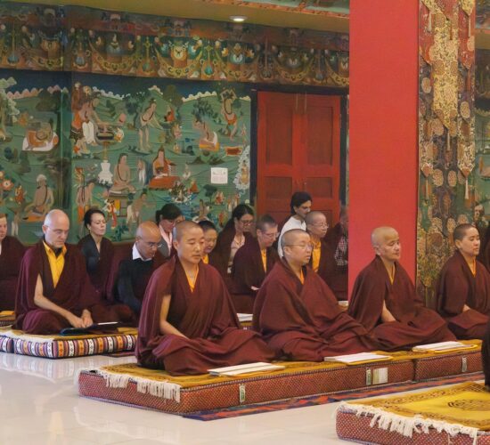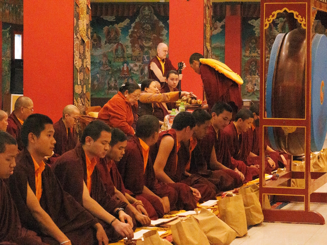 Viele weitere Sangha-Mitglieder, die nicht persönlich anwesend sein konnten, nahmen über einen Livestream Online an der Praxis teil. Die gesamte Versammlung vereinte sich in großer Hingabe, um das umfangreiche Ganachakra durchzuführen.